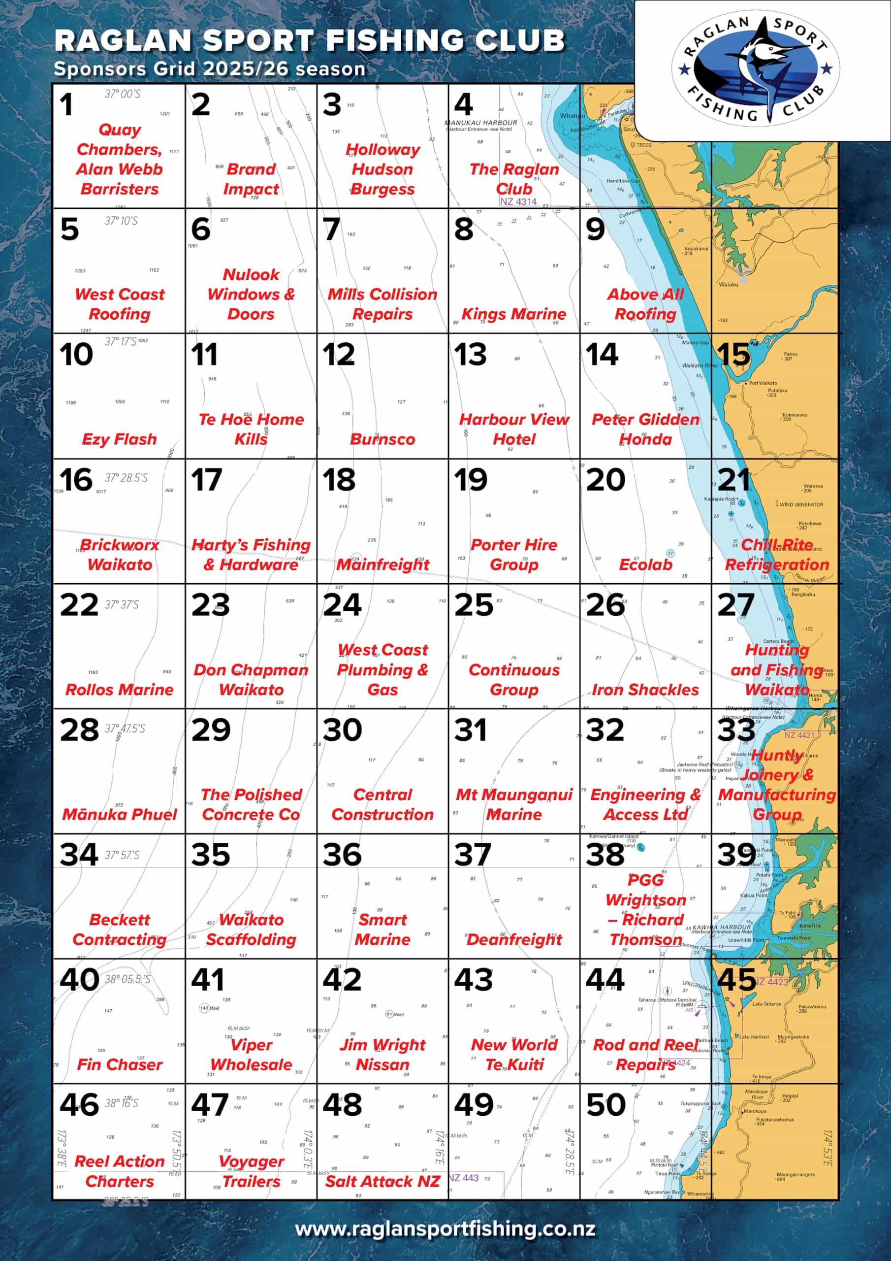 RSFC is a non for profit club (incorporated society) kept alive by the kind support of our sponsors. Some of our sponsors have been onboard with the club for 20+ years however as with the times, they can change too. The sponsors grid is completed annually and if you would like your business to be seen here please email info@raglansportfishing.co.nz for a sponsors prospectus.